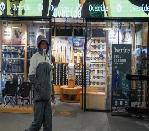 12月2日,在吉林市北大湖滑雪度假区,游客经过一家国产品牌雪具店。新华社记者 颜麟蕴 摄。
