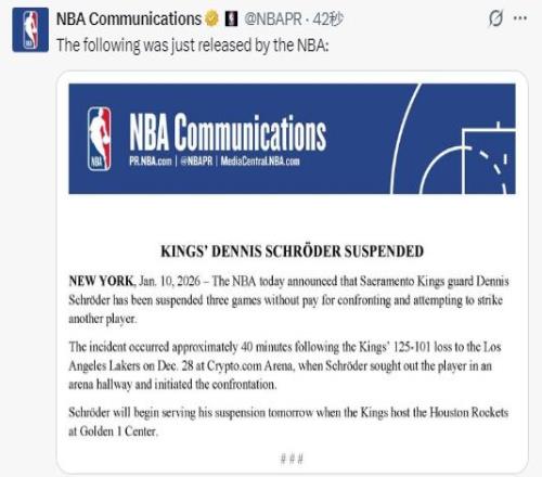 北京时间1月11日,NBA官方今日宣布,萨克拉门托国王队后卫丹尼斯-施罗德因与另一名球员发生对峙并试图动手击打对方,被处以禁赛三场且无薪的处罚。